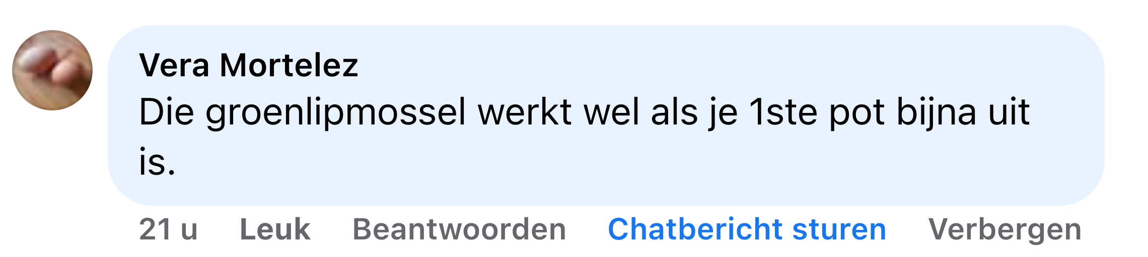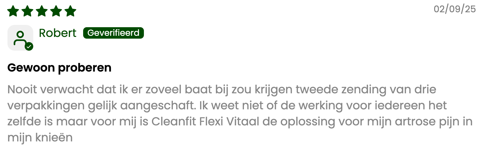 "Ik kocht 3 potten van deze FlexiVitaal terwijl ik door social media scrolde. Een impulsaankoop, geef ik toe. In het begin was ik sceptisch. Na een paar weken niet direct wereldschokkend. Maar omdat de reviews zo goed waren, gaf ik het nog een paar weken. En toen begon ik écht verschil te merken. Nog eens twee weken later… en mijn kniepijn? Helemaal weg! Alsof het nooit heeft bestaan."