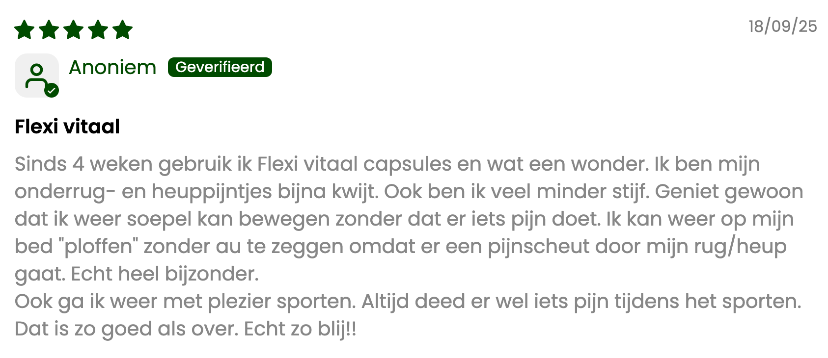Ik had al jaren last van stijven/stramme gewrichten en alleen fysiotherapie gaf tijdelijk verlichting. Ik was sceptisch over FlexiVitaal, maar besloot het toch te proberen. En ik moet toegeven: dit werkt! Geen pijnstillers meer nodig en ik voel me zoveel beter. Het enige ‘nadeel’? Mijn partner wil het nu ook gaan gebruiken!