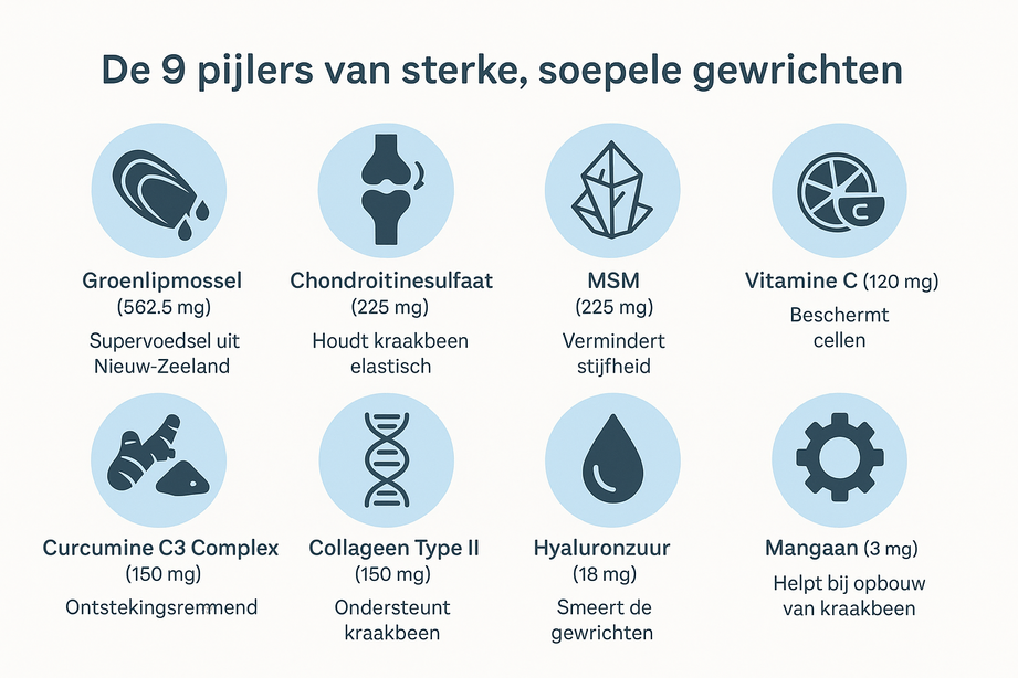 Het bleek dat Nederlandse voedingswetenschappers een revolutionaire combinatie hadden ontwikkeld van negen krachtige natuurlijke ingrediënten, elk met een specifieke rol bij gewrichtsherstel: